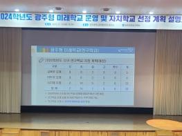 광주시교육청이 지난 19일 관내 학교 대상으로 ‘2024학년도 광주형 미래학교 운영 및 자치학교 선정 계획 설명회’을 개최했다고 밝혔다.이번 설명회는 광주형 미래학교 운영 안내, 내년도 자치학교 제도
