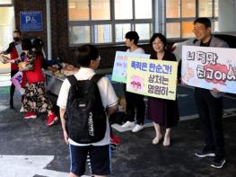 광주교육시민협치진흥원설립추진단이 지난 15일 광주 학부모 네트워크 ‘하모니’와 함께 치평중을 방문해 학교생활 응원 캠페인을 펼쳤다.17일 추진단에 따르면 이번 캠페인은 지지와 격려가 필요한 교사와