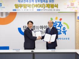 광주시교육청이 27일 학교건축설계에 내실화를 기하고자 광주건축사회와 ‘학교건축설계 상호협력을 위한 업무협약을 체결했다. 27일 시교육청에 따르면 이번 업무협약을 통해 광주건축사회 소속 건축사의