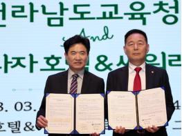 전라남도교육청이 21일 라마다프라자호텔&씨원리조트 자은도와 교직원의 복지증진을 위한 업무협약을 체결했다.이번 협약 체결로 전남도교육청 산하 22개 시·군 교육청 전 기관 교직원 및 가족들은 평일 최