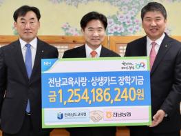 전남미래교육재단이 8일 NH농협은행 전남본부로부터 12억5,000여 만원의 ‘전남교육사랑·지역상생카드 장학기금’을 전달받았다. 전라남도교육청 비즈니스실에서 열린 이날 전달식에는 김대중 전남미래교