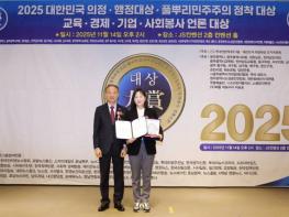 [중앙뉴스라인 = 전은희 기자] (사)대한민국청년유림회 박정하 대표(朴貞廈)가 지난 11월 14일 광주 JS컨벤션홀에서 열린 ‘제9회 대한민국 의정대상 및 풀뿌리 민주주의 정착대상 시상식’에서 ‘2025 대한…
