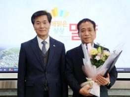 안병구 밀양시장이 지난 2일 시청 시장실에서 박용호 신임 밀양물산(주) 대표이사에게 임명장을 수여했다. 박 대표이사는 앞으로 2년간 밀양물산(주)의 지속적인 성장과 지역 농업 경쟁력 강화를 위한 중책