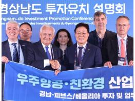 장피에르 라파랭 전 프랑스 총리가 19일(현지시각) 프랑스 파리에서 열린 ‘경상남도 투자유치설명회’에서 박완수 도지사를 만나 우주 항공 발전을 위해서 경상남도와 프랑스 지방정부 간 산업 협력 확대