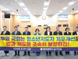 광주 남구의회(의장 남호현)는 27일 제318회 임시회 제2차 본회의에서 노소영 의원이 대표 발의한 ‘청소년지도자 처우개선 제도 마련 촉구 건의안’을 채택했다.노 의원은 먼저, 청소년이 가치관과 사회성