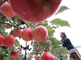 추석을 10여일 앞둔 29일 오전 경남 함양군 서하면 사과 농장에서 신근수씨가 잘 익은 고랭지 홍로사과를 수확하고 있다.
