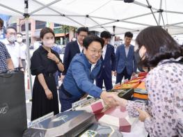 강기정 광주광역시장이 추석 명절을 앞두고 2일 오전 광산구 농협광주지역본부 주차장에 마련된 농산물직거래장터를 방문해 제수용품을 구입하고 농협 직원들을 격려했다.