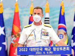 마크 셰이퍼(Mark Schafer, 준장) 주한미해군사령관이 6월 9일 대형수송함 독도함(LPH, 14,500톤급)에서 열린 제20회 함상토론회 개회식에서 축사를 하고 있다.[중앙뉴스라인=송상교기자] 해군은 6월 9일 인…