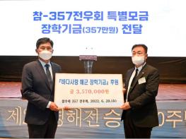 이해영 참-357전우회장(예비역 원사, 오른쪽)이 김판규(예비역 중장) 바다사랑장학재단 이사장에게 특별모금 장학금(357만원)을 전달하고 있다.…