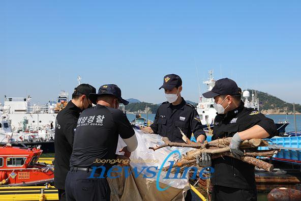 | 목포해양경찰서는 태풍 내습기를 대비해 경비함정 경찰관과 의무경찰 20여명이 22일 오전 목포해경 경비함정 전용부두(목포시 고하대로 소재) 항내 정화활동을 실시해 폐그물, 목재 구조물 등 해양쓰레기 약 1톤을 수거했다. |