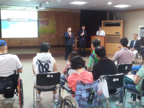 <2일 오후 3시 광주광역시 장애인종합복지관에서 장애인대물림예방사업 ‘으랏차차, 희망을 상속하세요!’ 교통사고 예방교육 프로그램을 진행하고 있는 한국장애인문인복지후원회 김호종 이사장.> |