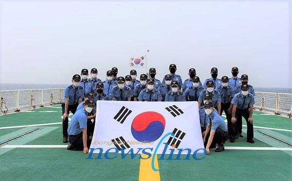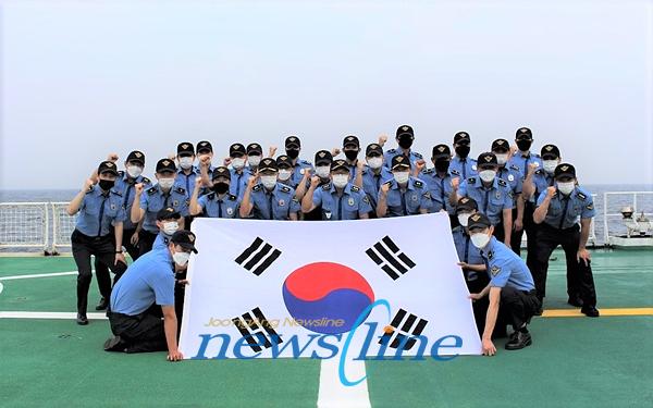 | 우리 서해바다의 해양주권 수호를 위해 불철주야 임무수행 중인 목포해양경찰서 3015함 경찰관들이 광복 76주년을 맞아 전남 신안군 홍도 북서방 해상에서 태극기를 펼치며 해양영토 수호 의지를 다졌다. |