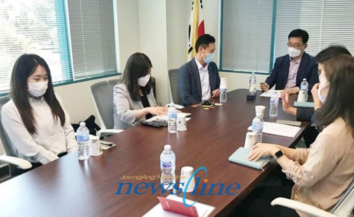 | 한국농수산식품유통공사(aT) 김춘진 사장은 미국 현지시간 25일 aT로스앤젤레스지사를 방문하여 올해 주요업무 추진현황을 보고받고 현안사항을 점검한 뒤, 미 서부 주요 한국식품 수입바이어들과 간담회를 가졌다.사진은 aT 로스앤젤레스지사 업무보고 모습이다. |