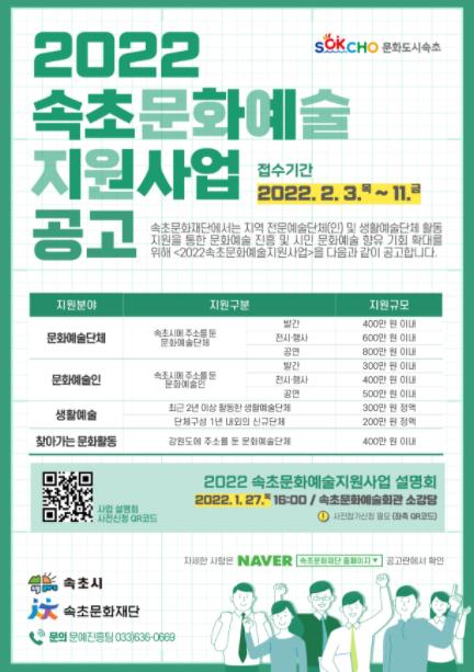 또한‘속초문화예술지원사업 설명회’를 개최하여 사전예약자를 대상으로 2022년도 속초문화예술지원사업의 방향과 내용 및 주요 지원신청 방안을 설명하고, 지원사업과 관련한 질의응답을 진행할 예정이다. 설명회는 1월 27일 오후 4시 속초문화예술회관 소강당에서 진행하며, 사전예약자에 한 해 참석이 가능하다.