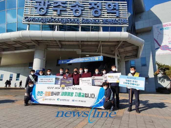 [중앙뉴스라인 = 송상교기자] 광주도시철도공사(사장 윤진보)는 최근 (주)에스알광주승무센터, 광주환경공단 등 유관기관과 합동으로 광주송정역 입구에서 「안전·청렴 문화 확산 캠페인」을 갖고, 시민들을대상으로 올바른 마스크 착용 요령, 도시철도 안전 이용 방법, 공직자의 이해충돌방지법 등을 홍보하며 마스크와 물티슈 등을증정했다.