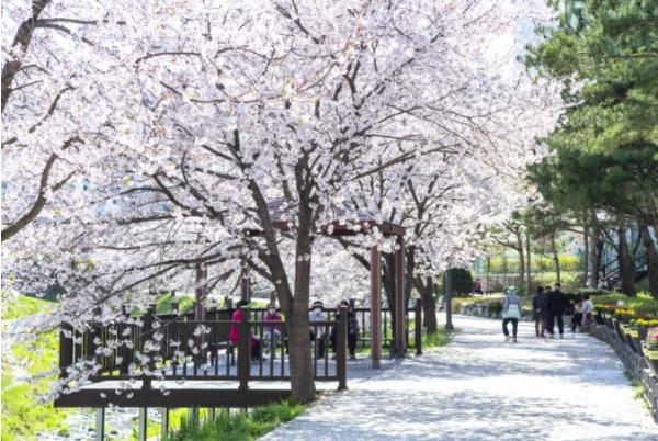 [중앙뉴스라인, 송상교기자] 양주시 백석읍에 위치한 가야1차 아파트 옆 하천길에서 시민들이 봄바람을 맞으며 막바지 벚꽃을 만끽하고 있다.