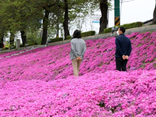 [중앙뉴스라인, 김용범기자] 정읍시민의 최대 휴식처인 정읍천 둔치에 봄 향기를 가득 머금은 꽃잔디가 만개해 눈부신 보라색 빛을 발산하고 있다.