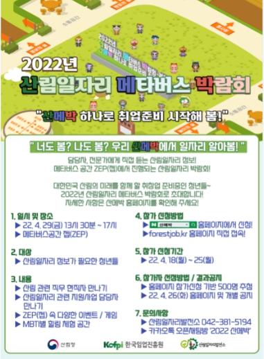 [중앙뉴스라인, 손영생기자] 산림청은 청년들의 산림분야 취업·창업 상담과 산림일자리 정보를 제공하기 위해 4월 29일 2022년 산림일자리 확장 가상 세계(메타버스) 박람회를 개최한다고 밝혔다.