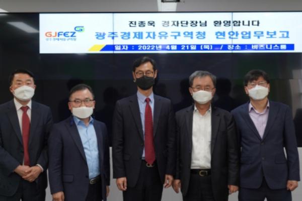 이날 광주경자청 비즈니스룸에서 열린 간담회는 김진철 광주경자청장과 진종욱 경제자유구역 기획단장(이하 ‘경자단장’)이 참석한 가운데 광주경자유구역 현황, 개청 원년 성과, 2022년 주요 목표 등 업무보고와 주요 현안, 건의 사항 순으로 진행됐다.