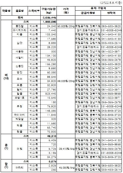 ??공급가능한 물량은 총 2,035톤으로 그 중 벼는 1,983톤 18개 품종(고시히카리, 동진찰, 미품, 삼광, 새봉황, 새일미, 신동진, 영진, 오대, 오륜, 일미, 일품, 조명1호, 추청, 하이아미, 해담쌀, 해품, 현품) 신청가능하다. 구입가격은 20kg당 49,020원(메벼), 50,820원(찰벼)이고, 콩은 49톤 1품종(대원)으로 5kg당 29,410원, 팥은 3톤 1품종(아라리)으로 5kg당 45,030원이다.
