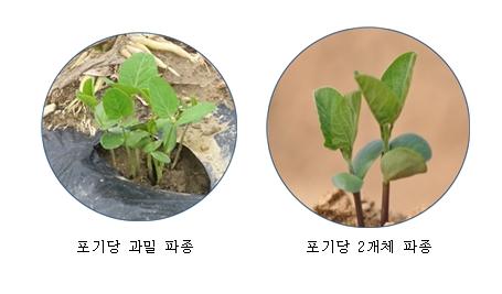 이랑과 포기 사이 거리는 알이 큰 장류·두부용의 경우 ‘70×15㎝’, 알이 작은 나물용 콩은 ‘60×10㎝’로 하는 것이 적정하나, 일찍 심거나 거름기가 많은 토양에서는 심는 거리를 다소 넓게 하는 것이 안전하다.