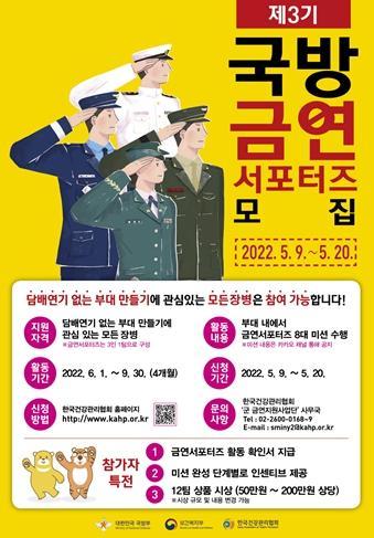 ‘제3기 국방 금연서포터즈’는 한국건강관리협회 누리집과 모집 포스터 QR코드 등을 통해 신청 가능하며, 기타사항은 군 금연지원사업단 사무국을 통해 문의할 수 있다.