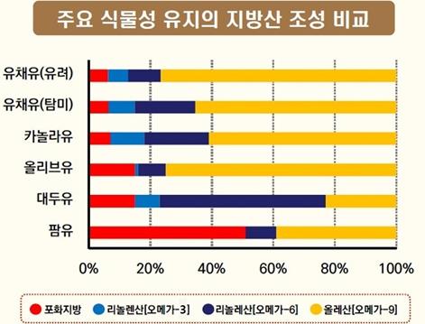 특히 농촌진흥청에서 육성한 품종으로 생산한 유채 기름에는 불포화지방산인 오메가-3(리놀렌산), 오메가-6(리놀레산), 오메가-9(올레산)이 골고루 함유돼 있다. 반면 많이 섭취하면 인체에 해롭다고 알려진 에루스산은 전혀 함유돼 있지 않아 식용에 적합하다.