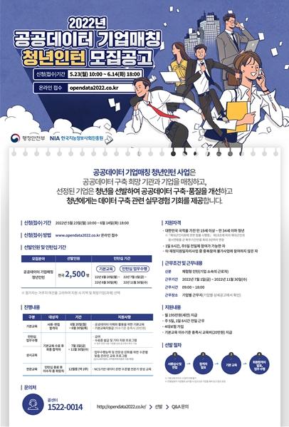 행정안전부는 ‘2022년 공공데이터 기업연계(매칭) 청년인턴 지원사업’ 참가 희망자 2천5백 명을 5월 23일(월)부터 6월 14일까지 모집한다고 밝혔다.