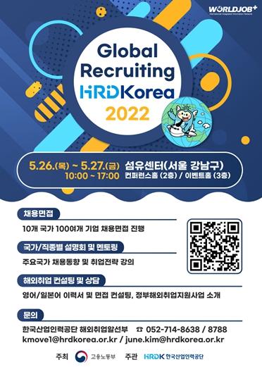 [중앙뉴스라인, 손영생기자] 한국산업인력공단이 주관하는 ‘2022 글로벌 리크루팅 박람회’(Global Recruiting HRDKorea 2022)가 5월 26일 10시 서울 삼성역 인근 섬유센터 3층 이벤트홀에서 개최됐다.
