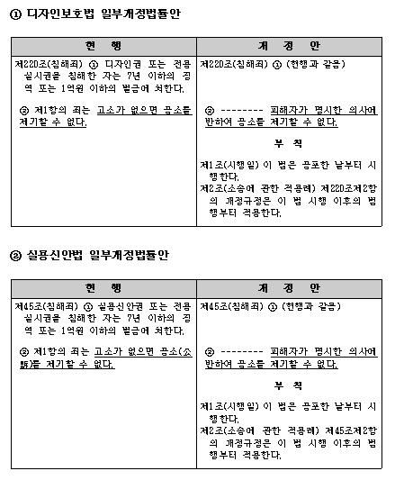 이번 개정은 2020년 특허권 침해죄를 ‘친고죄’에서 ‘반의사불벌죄’로 변경한 특허법 개정사항을 디자인권·실용신안권까지 확산한 것이다.