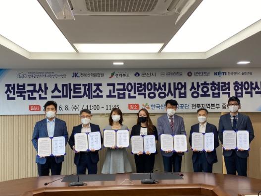 [중앙뉴스라인, 정영철기자] 거점산단인 군산국가산단이 스마트그린산단으로 선정됨에 따라 추진 사업의 일환으로 스마트제조 고급인력양성 사업을 전북산학융합원에서 수행하게 되어 6. 8. 산단공 전북본부와 공식 협약을 체결했다.