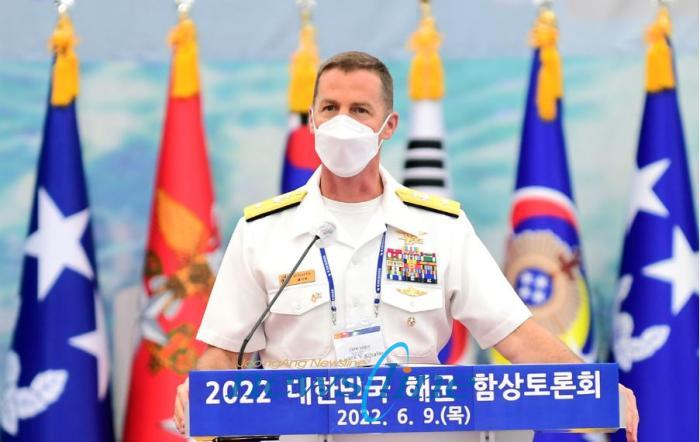| 마크 셰이퍼(Mark Schafer, 준장) 주한미해군사령관이 6월 9일 대형수송함 독도함(LPH, 14,500톤급)에서 열린 제20회 함상토론회 개회식에서 축사를 하고 있다. |