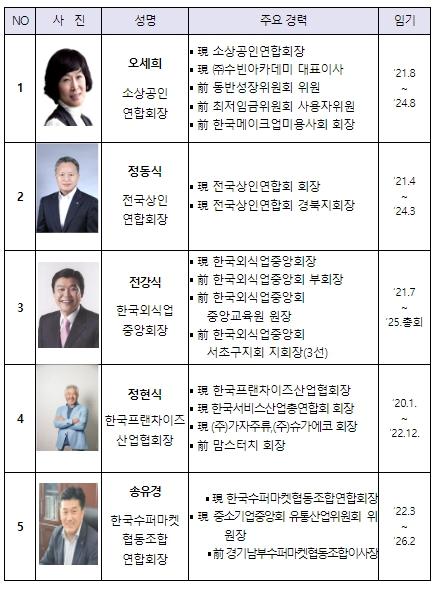정동식 전국상인연합회장은 전통시장 장보기 환경 구축의 필요성을 제안하고, 전강식 한국외식업중앙회장은 소상공인에 대한 채무조정 등 금융지원 방안과 민간 협?단체를 통한 업종별 맞춤형 특화교육 실시를 요청했다.