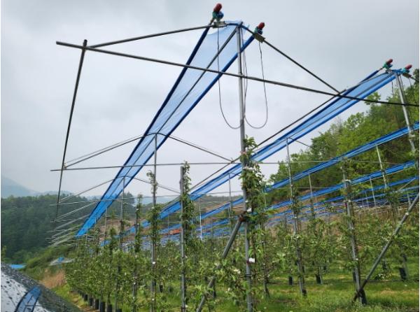 이번 시범사업은 농촌진흥청 국비지원(5천만 원)을 받아 총 사업비 1억 원을 들여 일소피해에 노출이 쉬운 사과 홍로 과원 3개소에 시범 운영한다.