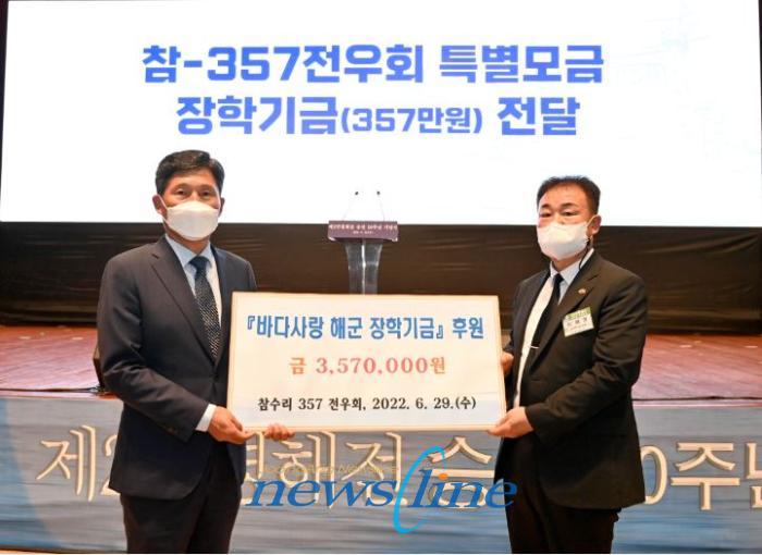 | 이해영 참-357전우회장(예비역 원사, 오른쪽)이 김판규(예비역 중장) 바다사랑장학재단 이사장에게 특별모금 장학금(357만원)을 전달하고 있다. |