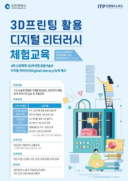 인천테크노파크(인천TP)는 다음 달 4일까지 ‘3D프린팅 활용 디지털 리터러시 체험교육’을 맡아 진행할 교육 전문기관(업)을 모집한다고 30일 밝혔다.
