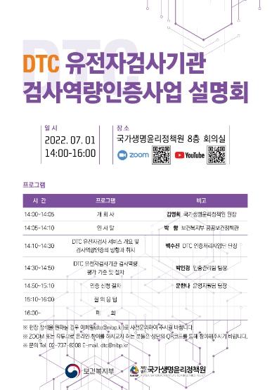 더불어 국가생명윤리정책원 김명희 원장은 “유전자검사기관이 유전정보 취급의 안전성·윤리성 등 필요한 역량을 확보하고 소비자에게 균형 잡힌 정보를 제공할 수 있도록 건전한 소비자 대상 직접 시행(DTC) 유전자검사 서비스 정착을 지원할 예정”이라고 밝혔다.
