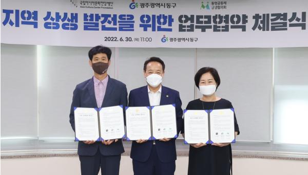 [중앙뉴스라인, 송상교기자] 광주 동구는 지난 30일 동명동 상권 활성화 및 상생발전을 위해 국립아시아문화전당재단, 동명공동체상생협의회와 기간 연장을 위한 지역상생 업무협약을 체결했다고 밝혔다.
