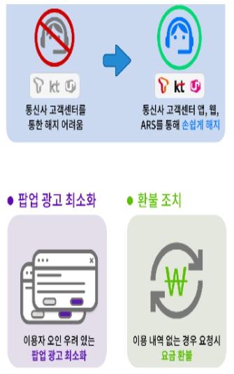 방통위는 이와 같은 이용자 피해가 발생하지 않도록 통신3사와 주요 유료 부가서비스 사업자를 대상으로 △이용자 혼동을 유발하는 팝업광고 최소화, △가입 완료 후 서비스명?요금?해지절차 등 중요사항 문자 고지, △부가서비스 제공사업자 뿐만 아니라 통신사(고객센터?홈페이지?앱)도 해지 기능 제공, △환불 요청시 이용내역이 없는 경우 요금 환불, △이용실적이 없는 경우 7개월 이후부터는 요금 미부과 등을 시정권고 하였다. 아울러 통신3사는 방통위 시정권고 이행을 위한 시스템 개선을 6월말 완료하였다.