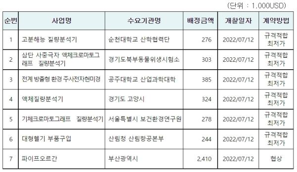 금주 집행되는 외자분야 입찰을 계약방법별로 보면,공주대학교 산업과학대학 수요 '전계 방출형 환경 주사전자현미경’ 등 “규격적합자 중 최저가에 의한 계약”이 전체 금액의 69.3%인 544만불 (약 71억 원), 부산광역시 수요 '파이프오르간’ 등 “협상에 의한 계약”이 전체 금액의 30.7%인 241만불 (약 32억 원) 으로 진행된다.