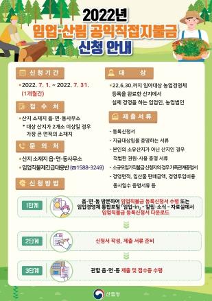 또한, 임업인이 임산물 생산업에 종사하는 요건으로 연간 120만 원 이상의 판매증빙서류를 제출해야 하는데, 2022년도에 한하여 마을 이·통장의 경작 사실 확인서를 대신 제출해도 인정토록 하였다.