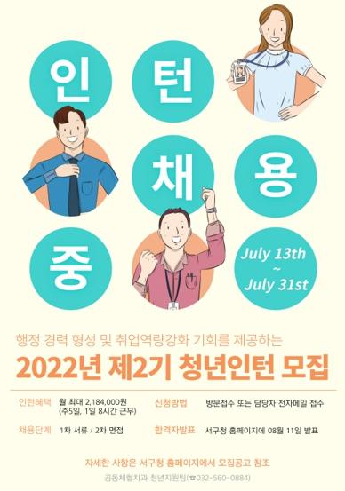 [중앙뉴스라인, 송상교기자] 인천 서구가 8월부터 미취업 청년의 역량 강화와 취업을 위한 ‘2022년 제2기 취업성공디딤돌 청년인턴사업’으로 오는 31일까지 청년인턴 참가자 25명을 모집한다고 14일 밝혔다.