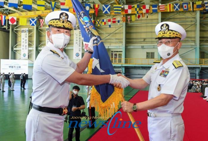 | 7월 15일 오전 해군 포항비행장에서 열린 해군항공사령부 창설식에서 이종호 해군참모총장이 이상식 초대 해군항공사령관에게 부대기를 수여하고 있다.해군항공사령부는 해상경계작전 핵심 부대로서 적 잠수함 위협 대응을 비롯해 해상항공작전계획 수립은 물론 교육훈련, 정비, 군수지원, 관제 및 운항 등의 임무를 수행하게 된다. |