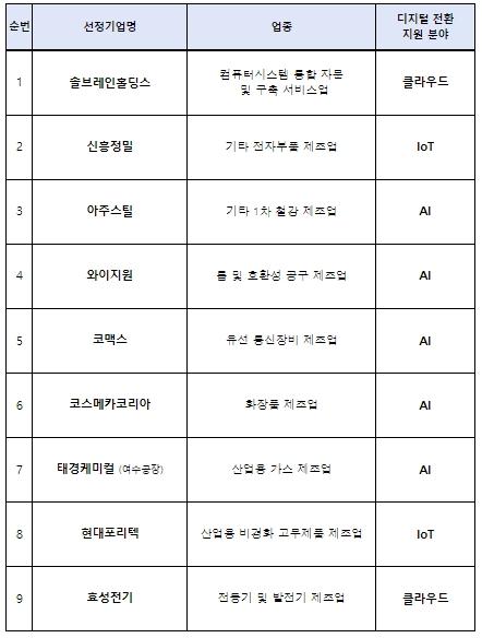 동 사업은 과학기술정보통신부와 함께 산업 수요에 기반한 우수 디지털 전환 솔루션을 발굴하여, 산업부가 디지털 전환을 추진 중인 중견기업이 검증된 솔루션을 활용할 수 있도록 지원하는 사업으로, 선정된 기업은 디지털 신기술 도입 비용(2억원 이내)을 지원받을 예정이다.
