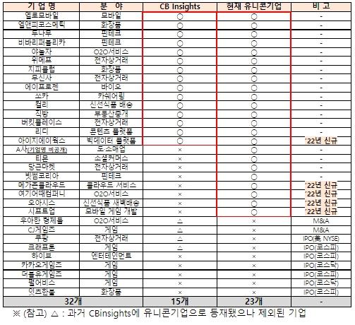 이번에 추가 파악된 거대신생기업(유니콘기업)들을 포함하면 ’22년 상반기 기준 비상장기업으로 기업가치 1조원을 돌파한 이력이 있는 기업도 32개사로 작년 말 27개사 대비 늘었다. 현재 거대신생기업(유니콘기업)에 포함되지 않은 9개사는 상장이나 인수합병(M&A)로 제외됐다.