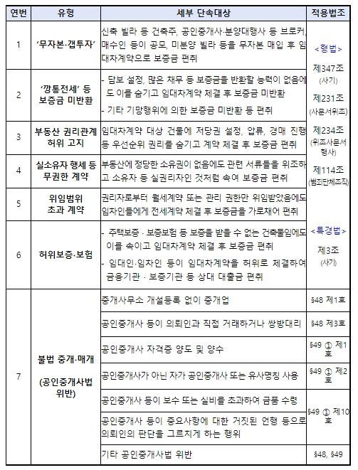경찰은 그간 전세사기 단속사례를 자세히 분석하여, ① 무자본?갭투자, ② ‘깡통전세’ 등 고의적 보증금 미반환, ③ 부동산 권리관계 허위고지, ④ 실소유자 행세 등 무권한 계약, ⑤ 위임범위 초과 계약, ⑥ 허위보증?보험, ⑦ 불법 중개·매개행위 등 7개 유형을 중점 단속대상으로 선정하였다.