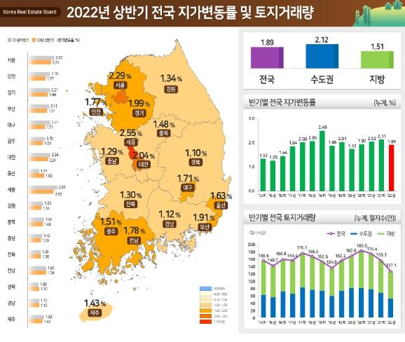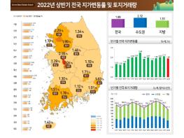 [중앙뉴스라인, 장성대기자] 국토교통부와 한국부동산원(원장 손태락)은 ‘22년 상반기 전국 지가는 1.89% 상승하여 ‘21년 하반기(2.11%) 대비 0.22%p, ‘21년 상반기(2.02%) 대비 0.13%p 감소했다고 밝혔다.