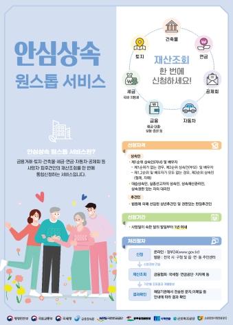 ?사망자 재산조회 통합처리(안심상속 원스톱서비스)?는 상속인이 금융, 국세·지방세, 국민연금, 토지, 건축물 등 사망자의 재산을 한 번에 조회할 수 있는 서비스로, 2015년 6월에 서비스를 실시한 이후로 2022년 6월까지 약 111만 명(누적)이 이용했다.