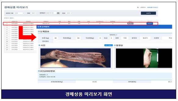 온라인 경매란 도매시장에서 돼지고기 지육 영상, 축산물 등급판정 결과, 정육률, 삼겹살 총량 등 상품성을 판단할 수 있는 객관적인 정보를 온라인 방식으로 추가 제공하면, 도매시장 구매자인 중도매인, 매매참가인이 장소의 제약 없이 온라인으로 경매에 참여하여 낙찰받는 방식을 말한다.