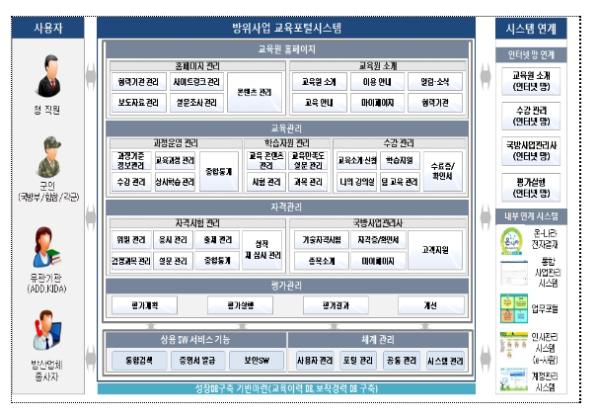 ‘방위사업 교육포털시스템 구축 사업’은 ?교육 관련 홍보 및 정보공유를 위한 홈페이지 ?교육 全 과정에 대한 전산화를 지원하는 교육관리시스템 ?국방사업관리사 자격관리시스템 ?교육 결과를 분석?종합 관리하는 평가관리시스템 등을 개발한다.